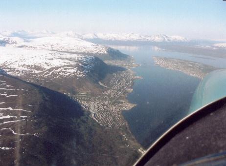 Ein kurzer Trip entlang der Felsenküste brachte uns nach Hammerfest. Im Wasser der Felsen spiegelt sich der Himmel, unten an den Ufern ist Frühling, oben auf den Bergen schmilzt gerade der Schnee. Bergseen stürzen ihre Wassermassen in mehreren Wasserfällen in das Meer. Ungewohnt der Landeanflug auf Hammerfest. Der Flugplatz, auf einem Felsen, taucht im Queranflug hinter einem höheren Felsen auf. Die Piste, etwa 800 m lang, reicht auch für Turboprops.